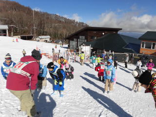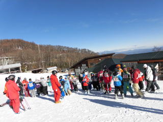 ![]() こちらは初級クラス。 スキーの支度を整え、準備運動を行います。 |